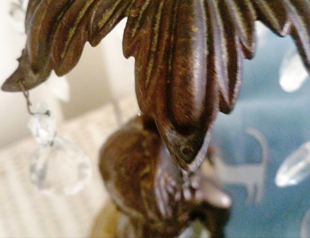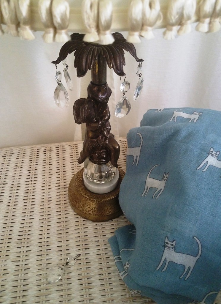 Look close beneath the lamp, just to the left of the lowest white cat on my scarf. You’ll see one of the crystals fell down. That’s what I’d heard. But why ~ and how? ~ did it fall?